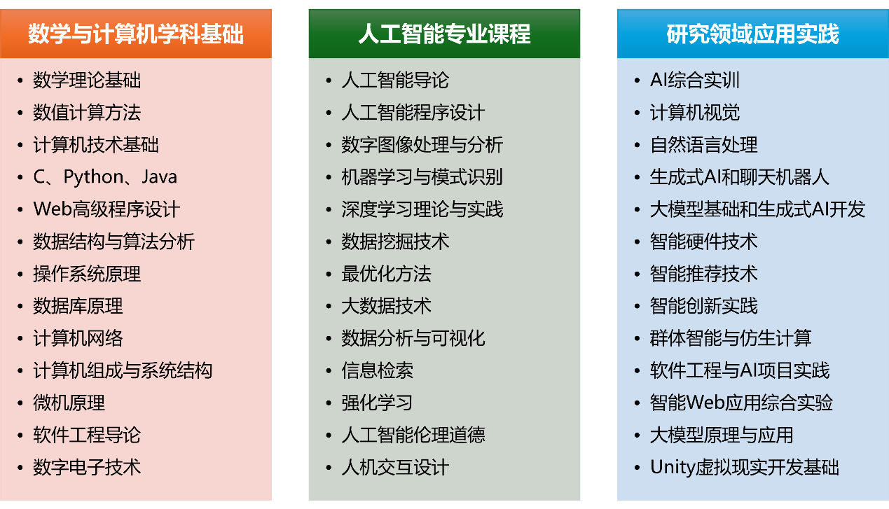 人工智能专业核心知识领域以数学理论、计算机技术为基础,以人工智能程序设计、机器学习与模式识别、计算机视觉、自然语言处理等为主干,涉及数据结构与算法、最优化方法与应用、深度学习理论与实践、数据分析与可视化、数据挖掘、智能推荐、大模型原理与应用等专业知识。主要包括数学与计算机学科基础、人工智能专业课程、人工智能领域应用实践三大板块: