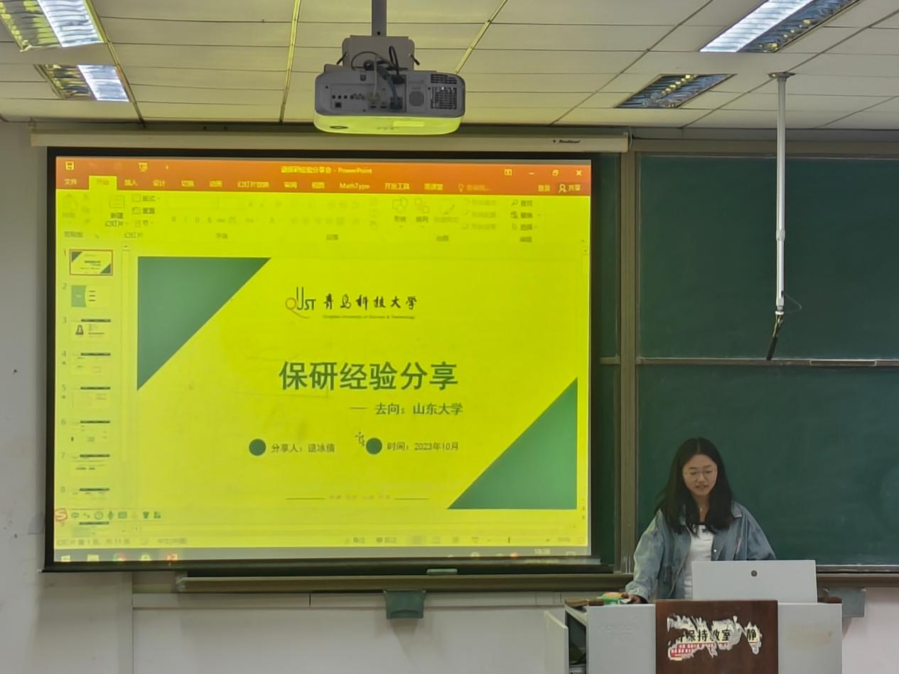 10月20日,太阳集团tyc234cc在明德楼230教室举办“权益与你,‘研’路同行”保研经验分享会。2020级优秀学生代表樊怡麟、刘毅、逯冰倩、宫传政进行经验分享,数科科学学院170余名学生参加分享会。