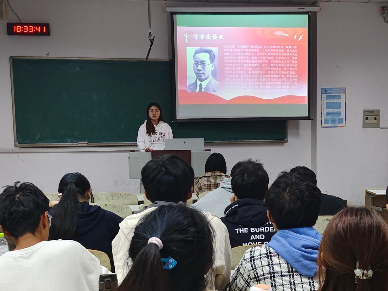 本次团课中,储淑琪分四个部分向同学们介绍了共青团的历史和使命,阐述了共青团在中国青年运动中的重要地位和作用。第一部分,共青团是中国青年运动的“先锋队”,讲述了共青团的艰难诞生历程,强调了共青团在中国革命历史中的重要地位和作用。第二部分,共青团是救亡兴国的“排头兵”,带领同学们回顾了自新文化运动以来,中国先进青年知识分子在救国救民道路上力挽狂澜,用先进的知识武装头脑,抛头颅、洒热血的壮丽事迹。在党的十八大以来,广大青年也勇做时代先锋,纷纷为了实现中国梦贡献自己的力量。第三部分,共青团是党永葆青春的“保鲜剂”,通过观看共青团中央发布的宣传视频,同学们对共青团的使命责任和成长历程有了更清楚的认识。第四部分,共青团是实现民族复兴的“生力军”,以陈独秀、李大钊、毛泽东、周恩来等革命家的青年壮志为例,号召同学们树立理想远大、坚定信念,牢记使命与担当,时刻不忘忧患意识,牢记青春使命担当,继承和弘扬以伟大建党精神为源头的红色精神谱系,勠力同心赓续红色血脉,为实现中华民族的伟大复兴续写新的青春荣光。