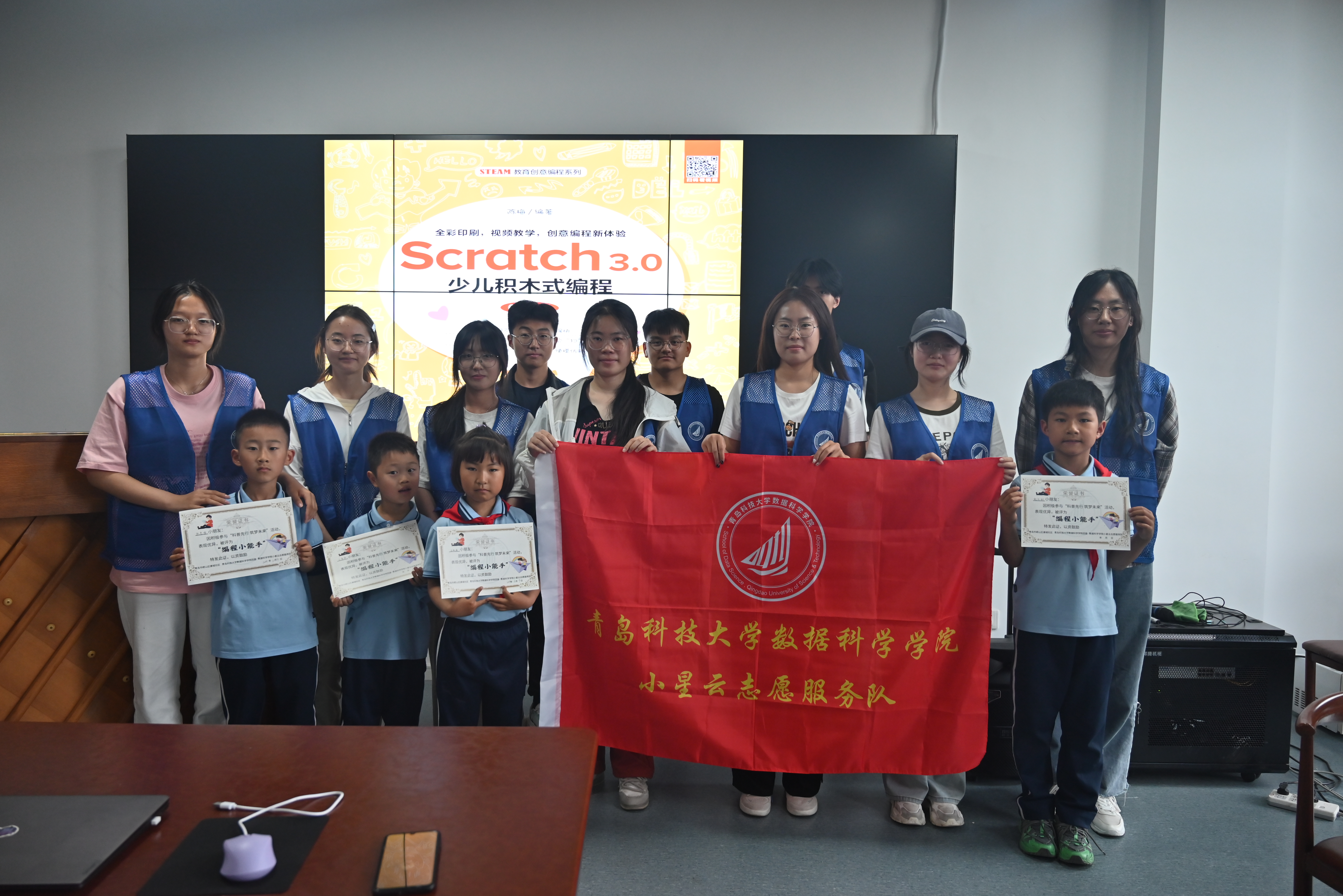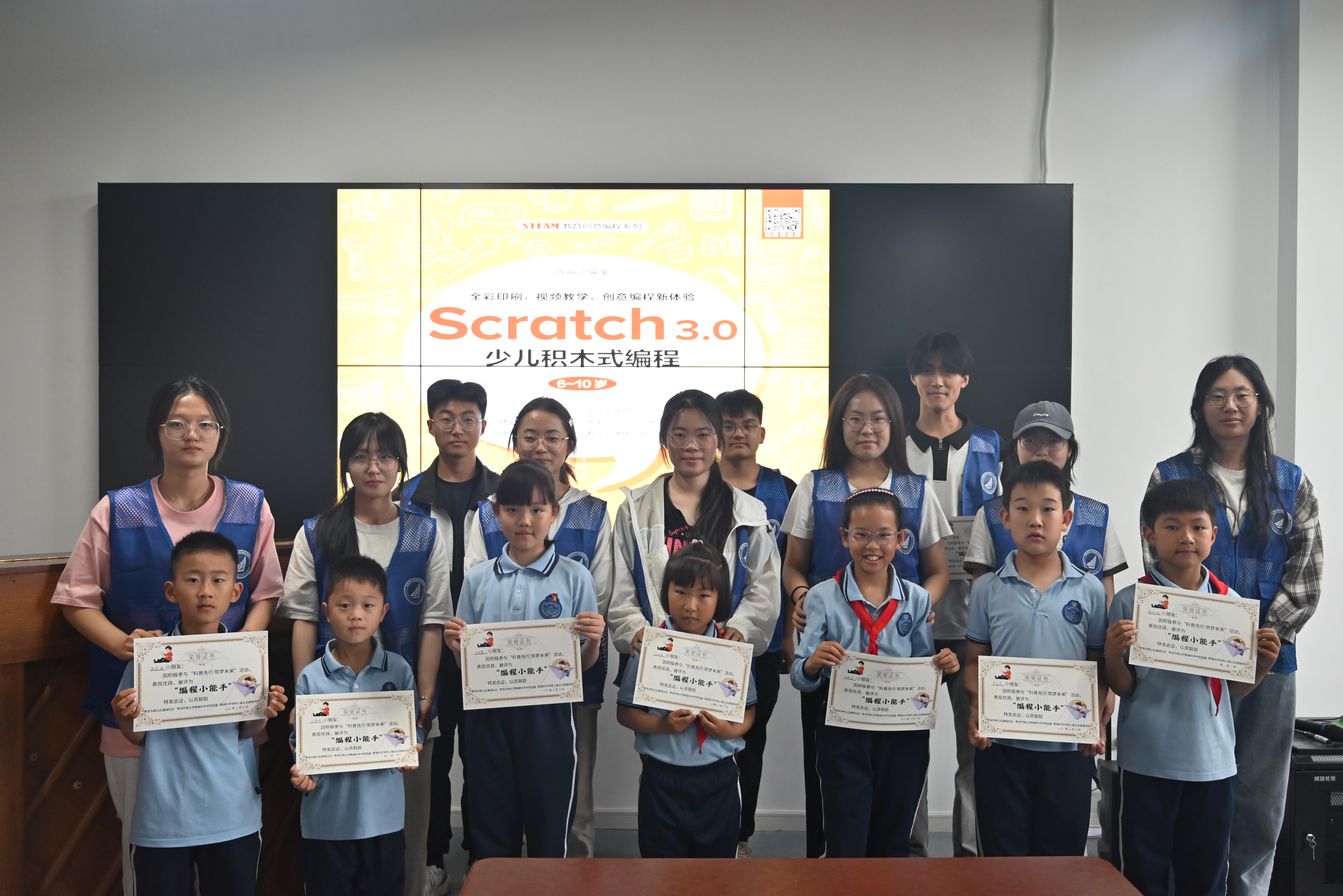 在活动开始前,志愿者们早已自备电脑并配置好Python环境,同时根据教学计划自制课程PPT,以确保教学内容既有趣又富有教育意义。自4.16启动以来,共举办了五期主题不同的教学课堂,第一期以启蒙小朋友的编程思维为主题,志愿者们通过生动有趣的故事和互动游戏,介绍编程的基本概念,让小朋友们在游戏中自然而然地理解编程的逻辑思维,同时激发他们对进一步学习的兴趣。第二期至第五期基于Scratch 3.0进行教学,志愿者们利用Scratch 3.0这一少儿编程平台,引导小朋友通过拖放编程积木来创建简单的动画和游戏。这种方法不仅易于上手,还能有效地帮助小朋友们理解编程逻辑,同时激发他们的创造力和解决问题的能力。此外,志愿者们还将分享自己在编程学习过程中的经验和心得,帮助小朋友们建立起对计算机科学的正面认识。最后,每位参与的小朋友都获得了颁发的奖状,以示鼓励。