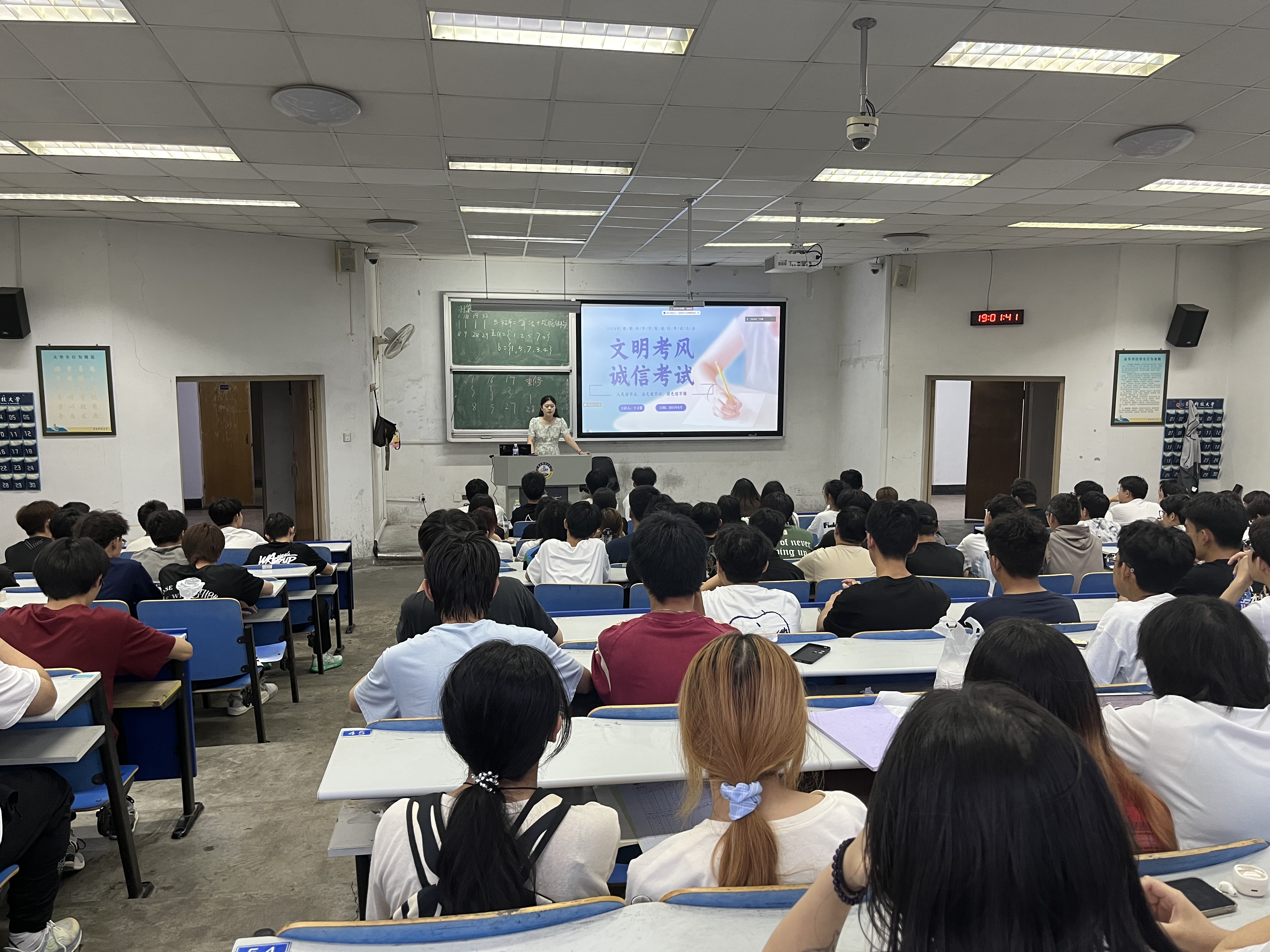 为进一步加强学风建设,营造风清气正的考试环境,6月30日晚,太阳集团tyc234cc于弘毅楼E101教室召开“文明考风 诚信考试”考风考纪教育大会。此次大会采取线上线下结合的方式,由辅导员卞文馨主讲,2021级、2023级全体学生线下参会,部分学生家长线上参会。