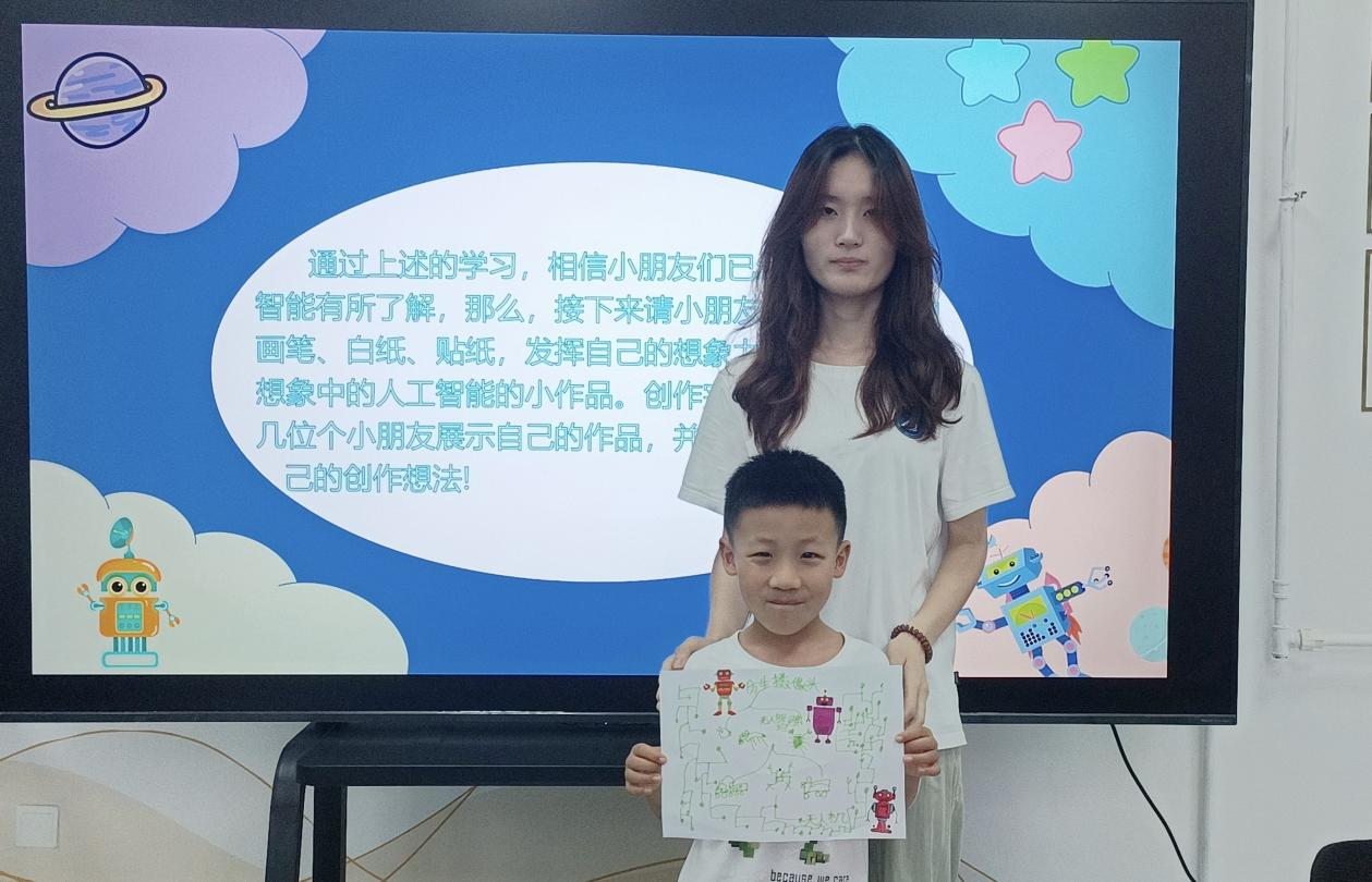 互动体验环节更是是高潮迭起、精彩纷呈。在“AI 写诗”活动中,孩子们怀着好奇与期待,访问诗三百或九歌——人工智能写诗系统,兴致勃勃地输入自己喜欢的关键词或充满幻想的主题,当独特而优美的诗作瞬间生成时,孩子们的脸上绽放出惊喜与自豪的笑容。“AI 绘画”环节同样充满了惊喜与欢乐。孩子们在体验 AI 绘画的过程中,通过输入充满想象力的文字描述或精心选择心仪的风格,一幅幅如梦如幻、充满奇思妙想的画作便呈现在眼前。而在奇思妙想环节中,小朋友们拿到了丰富多样的手工材料,如色彩斑斓的卡片、充满科技感的小贴纸、五彩的画笔等。他们充分发挥天马行空的想象力,用心制作出了与人工智能相关的小作品。有的小朋友精心绘制了生动可爱、功能强大的智能机器人图案,仿佛它能随时为人们排忧解难;有的则独具匠心地制作出了充满未来感的智能小屋模型,让人对未来的居住环境充满憧憬。