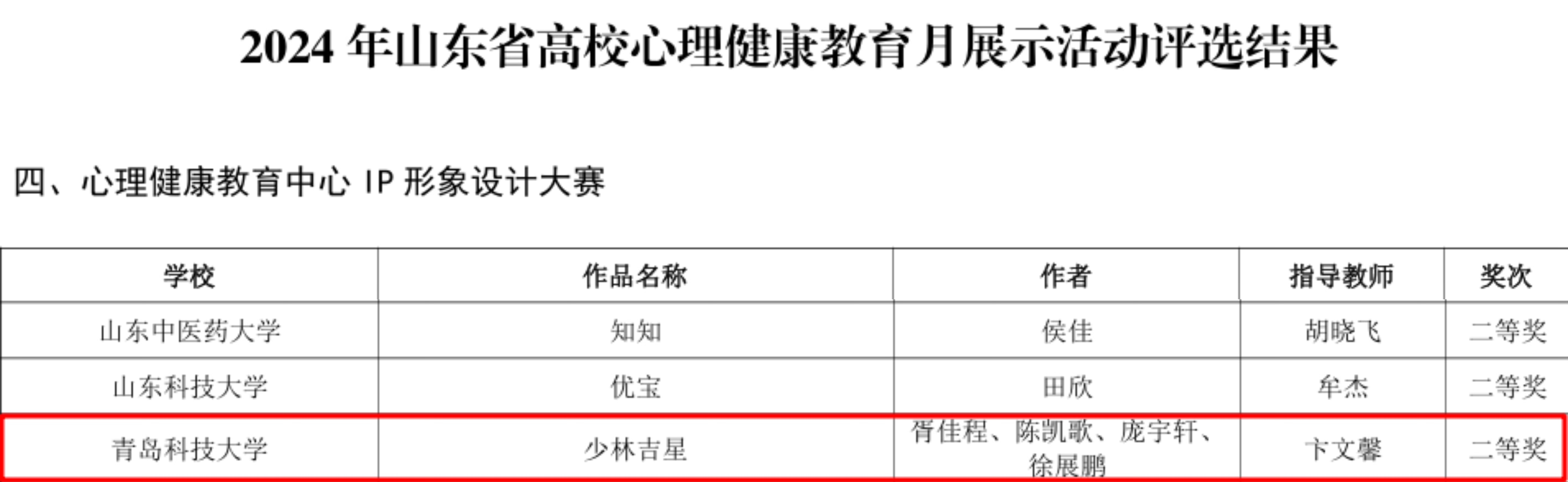 近日,山东省高等学校思想政治教育研究会、大学生心理健康教育专业委员会公布了2024年山东省高校心理健康教育月展示活动评选结果,太阳集团tyc234cc《少林吉星》获得心理健康教育中心IP形象设计大赛二等奖。