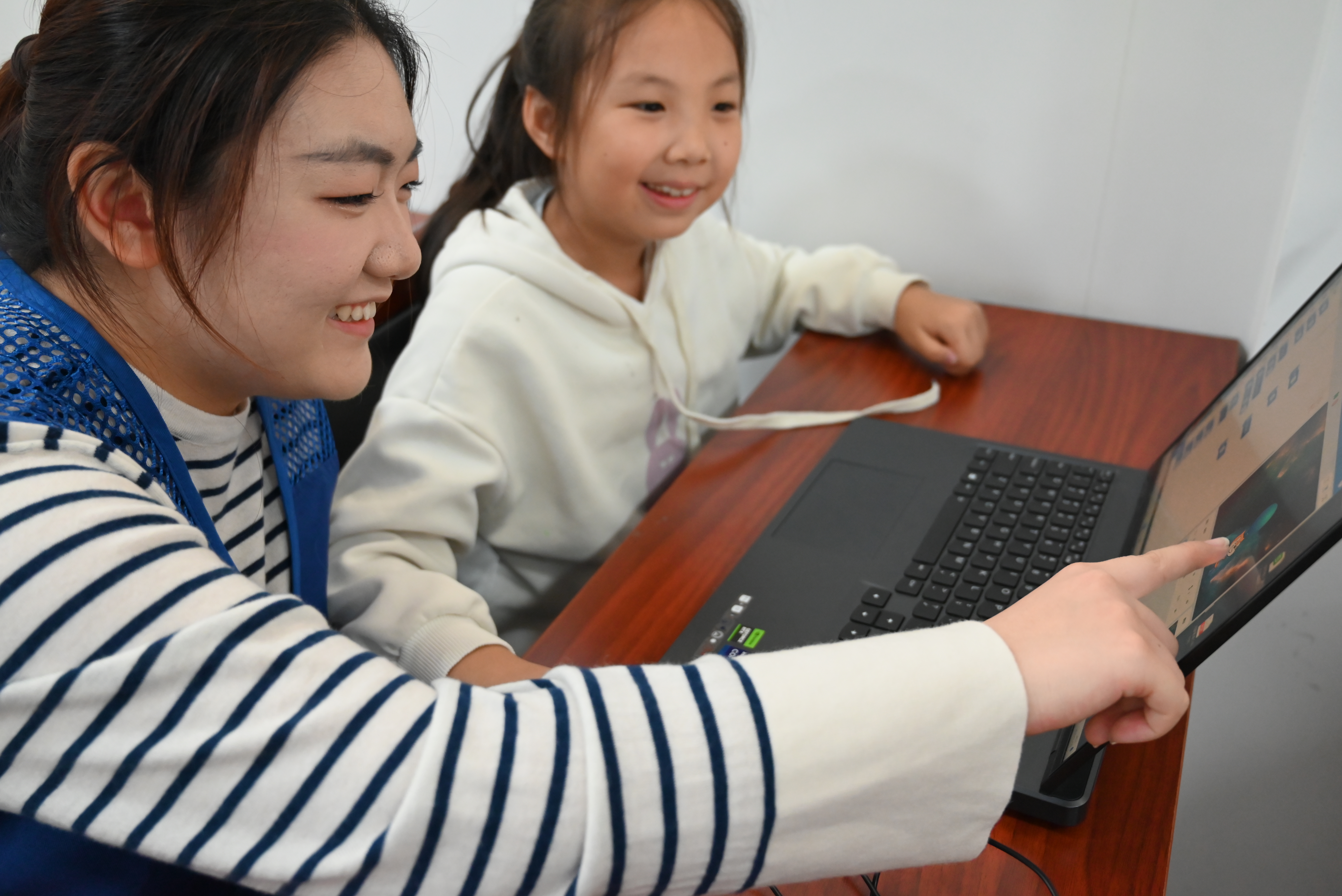 面向低年级小朋友的志愿者则重点讲授scratch的第二章与第三章“翱翔的小鸟”内容。志愿者们操作着电脑,展示着色彩斑斓的编程界面和可爱的小鸟形象,一步一步引导孩子们如何通过编程让小鸟在屏幕上自由翱翔。孩子们的小手在键盘上欢快地跳跃,每一次敲击都带着对创造的热情,现场充满了欢声笑语。