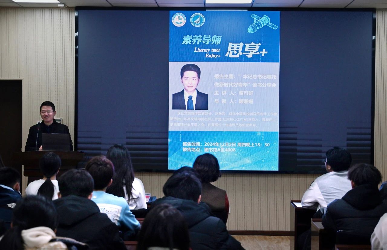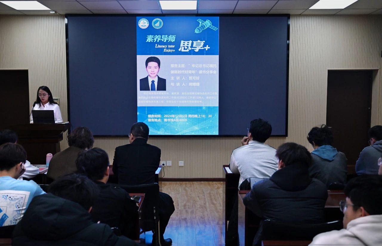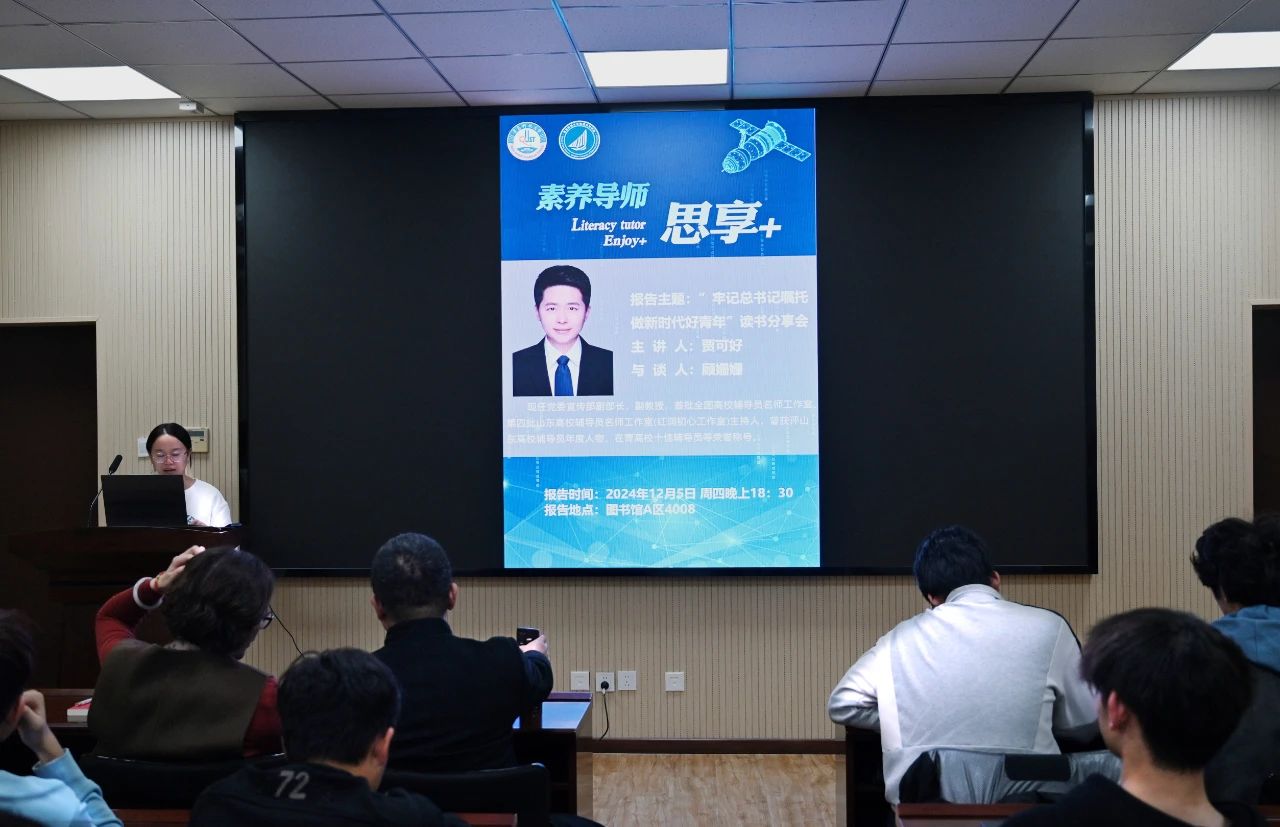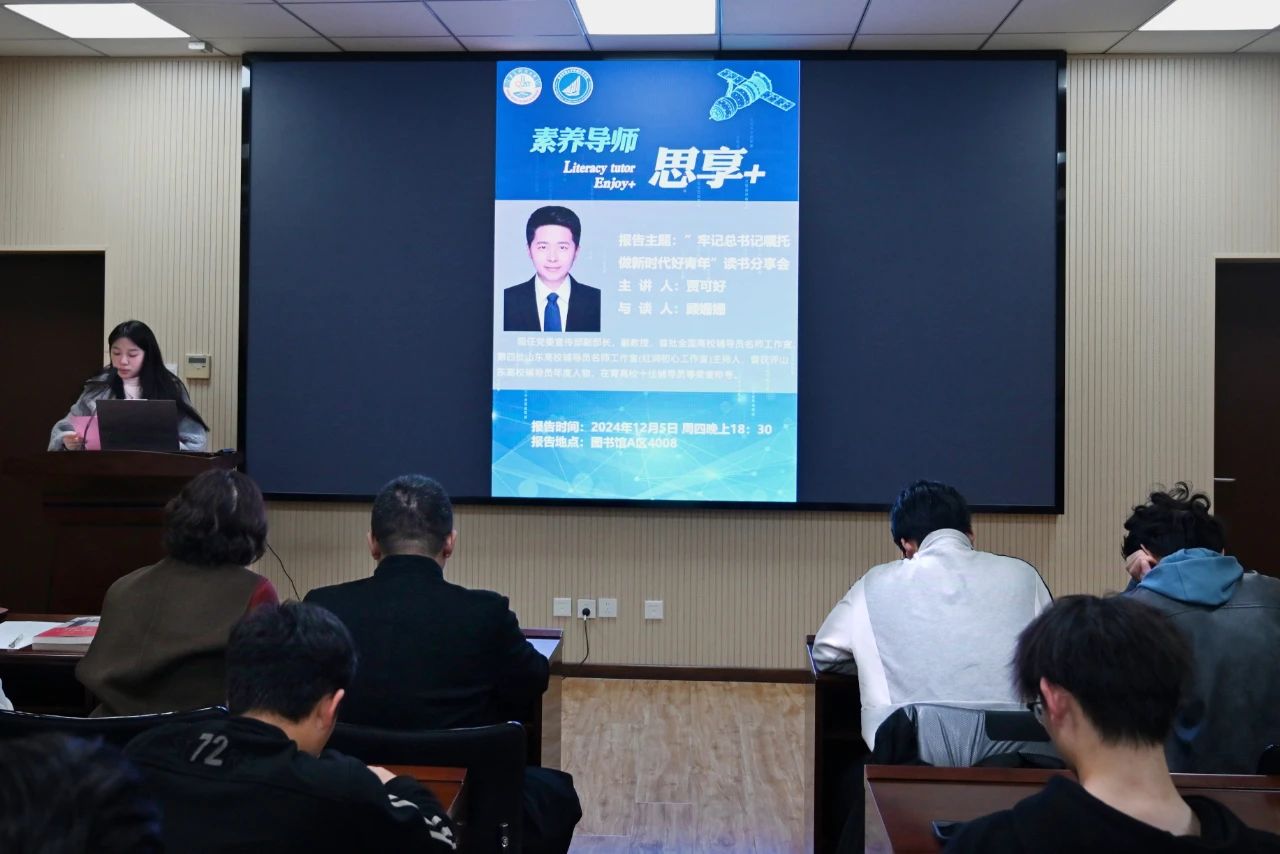 12月5日晚上,太阳集团tyc234cc在学院楼4008会议室顺利开展了“素养导师思享+”第九期素养课程——“牢记总书记嘱托做新时代好青年”读书分享会。此次课程邀请到学校党委宣传部副部长、副教授贾可好担任主讲嘉宾,马克思主义专业研究生朱彦祯、艺术学院本科生王莉汶作为分享嘉宾,学院2023级和2024级部分本科生参与此次分享会。