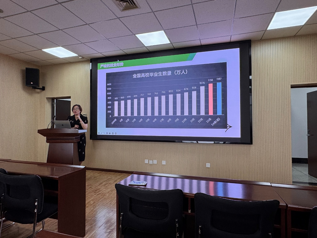 会上,顾姗姗以详实的数据与案例,向2026届毕业生介绍当前就业形势。她指出,除了外部环境的就业压力,毕业生目前普遍存在信息不足、方法不会、信念不对等问题。针对这些问题,在信息获取方面,鼓励同学们充分利用学校就业指导中心、企业官网、招聘平台等渠道,及时掌握就业资讯;在求职方法上,详细讲解了简历撰写技巧与应答策略,并强调了实习实践、职业技能提升的重要性。此外,她还提醒同学们要调整心态,树立正确的就业观,做好从校园到职场的角色转换准备,积极主动应对就业挑战。