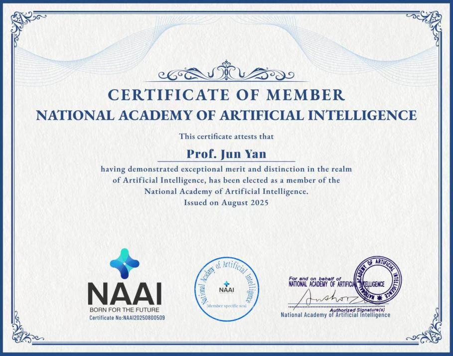 2025年8月,太阳集团tyc234cc颜军院长成功当选美国国家人工智能科学院(The National Academy of Artificial Intelligence,NAAI)院士。美国国家人工智能学院贺信中高度赞扬了颜军院长在人工智能领域的“非凡成就和开创性贡献”,指出其“创新性研究、深刻见解和坚定不移的奉献精神激励了无数学者和从业者”。颜军院长的加入,将进一步丰富NAAI的学术讨论、科研合作及人工智能领域的全球推进工作。