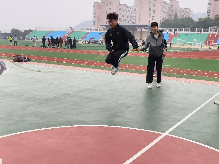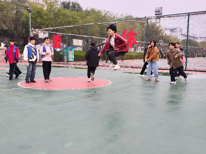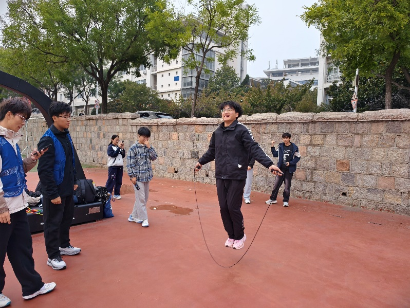 在3分钟10人长绳长绳“8”字跳项目中,各参赛队伍提前研判战术、优化阵型。2 名摇绳队员紧握绳柄,哨声响起后,长绳如弧线般高速旋转,8 名跳绳队员紧盯绳体轨迹,沿“8”字路线灵活穿梭,起跳落地衔接流畅。其中,人工智能 242 班解俊超率领的团队配合尤为默契,队员精准把控节奏,最终以 182 次的累计成功次数斩获该项目冠军,将团队协作力量展现得淋漓尽致。
