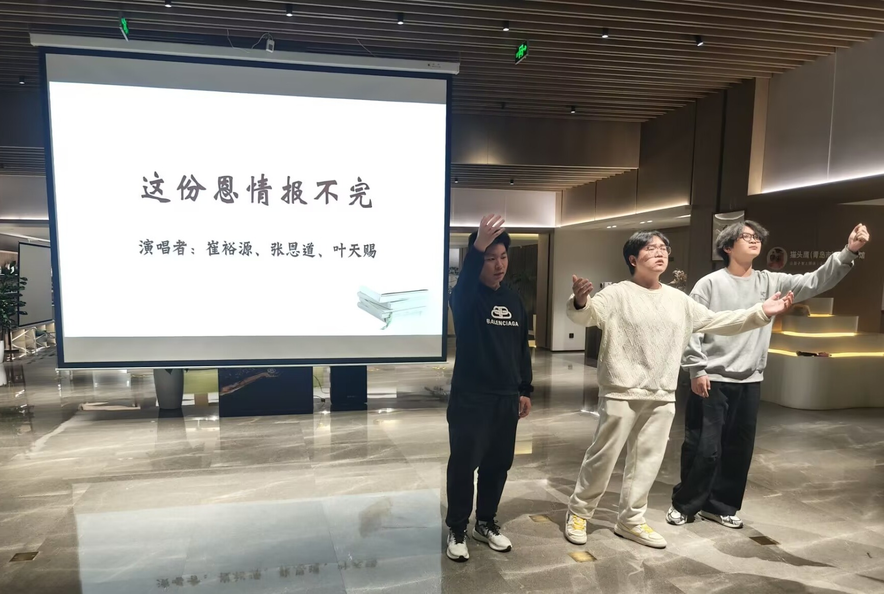 分享环节后,艺术学院叶天赐、崔裕源、张恩道登台演唱《松花江上》《再看一眼亲人》《这份恩情报不完》,深情的演唱为活动增添了浓厚情感氛围。