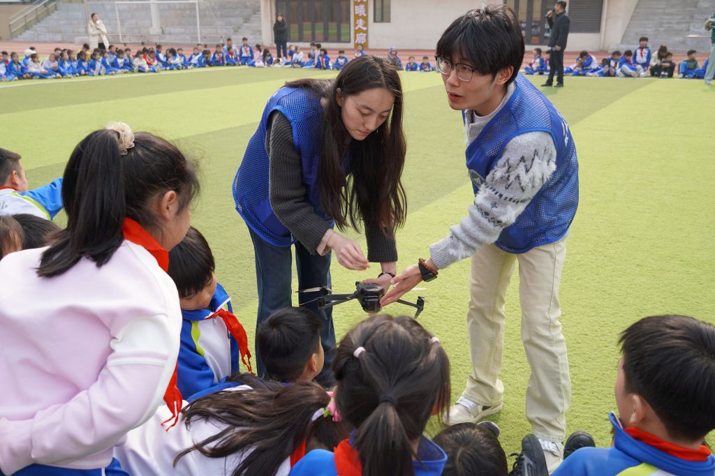 理论宣讲环节结束后,志愿者组织开展无人机实操体验活动。志愿者细致讲解无人机运行原理、操作规范及安全注意事项,在志愿者的悉心带领下,学生们近距离接触无人机,亲手体验操控过程,真切感受前沿科技的魅力,体会科学探索带来的乐趣。