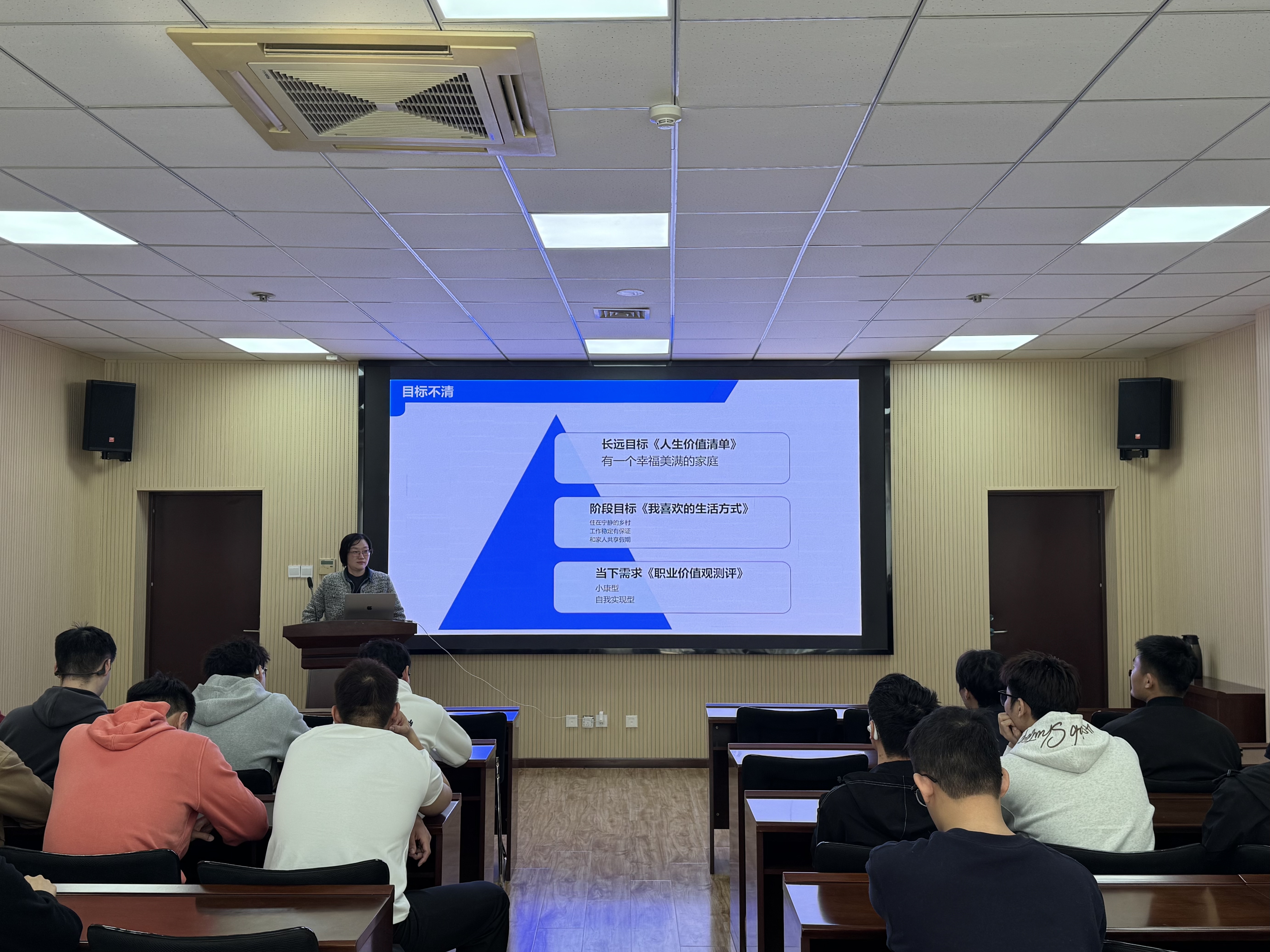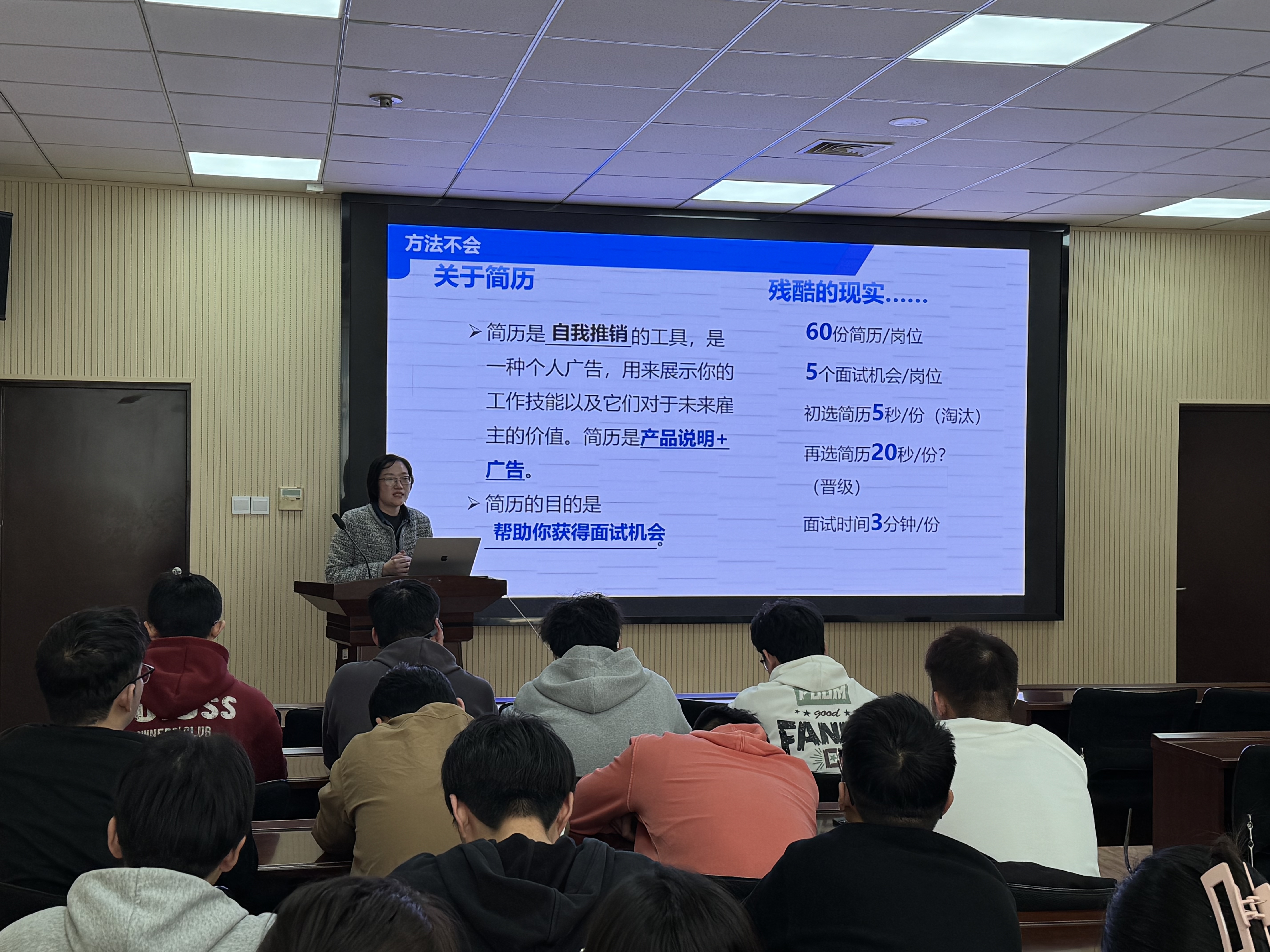 会上,顾姗姗结合详实的数据与典型案例,深入分析了当前的就业形势。她指出,除外部环境带来的就业压力外,毕业生中普遍存在目标不清、信息不足、方法不会等突出问题。针对这些问题,在目标设定上,她建议同学们分阶段确立短期、中期与长期目标;在信息获取上,详细介绍了各类求职渠道、就业信息的搜集与探索方法;在求职方法方面,通过具体案例讲解了简历撰写与面试的实用策略。此外,她特别强调,机会只留给有准备的人,提醒同学们及时调整心态,树立理性、务实的就业观。