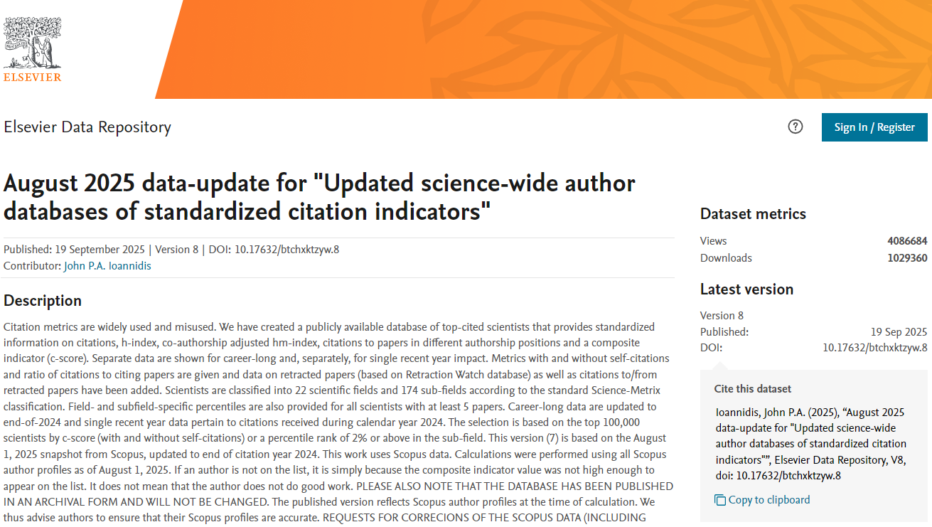 据了解,全球前2%顶尖科学家榜单是斯坦福大学John P. A. Ioannidis教授团队与Elsevier合作的项目成果。基于Scopus数据库的引用数据系统分析,以被引数(区分自引和他引,提供自引数据)、H指数、HM因子等6种质变进行综合评估,并在最近的迭代中添加有关撤稿论文的数据,为科学家长期的科研表现提供了一个衡量指标,能够客观真实反映科学家的全球学术影响力。该榜单从全球近700万名科学家中遴选出世界排名前2%的科学家,分为22个学科领域和174个细分子学科领域。榜单分为“生涯科学影响力排行榜”和“年度科学影响力排行榜”两个榜单。