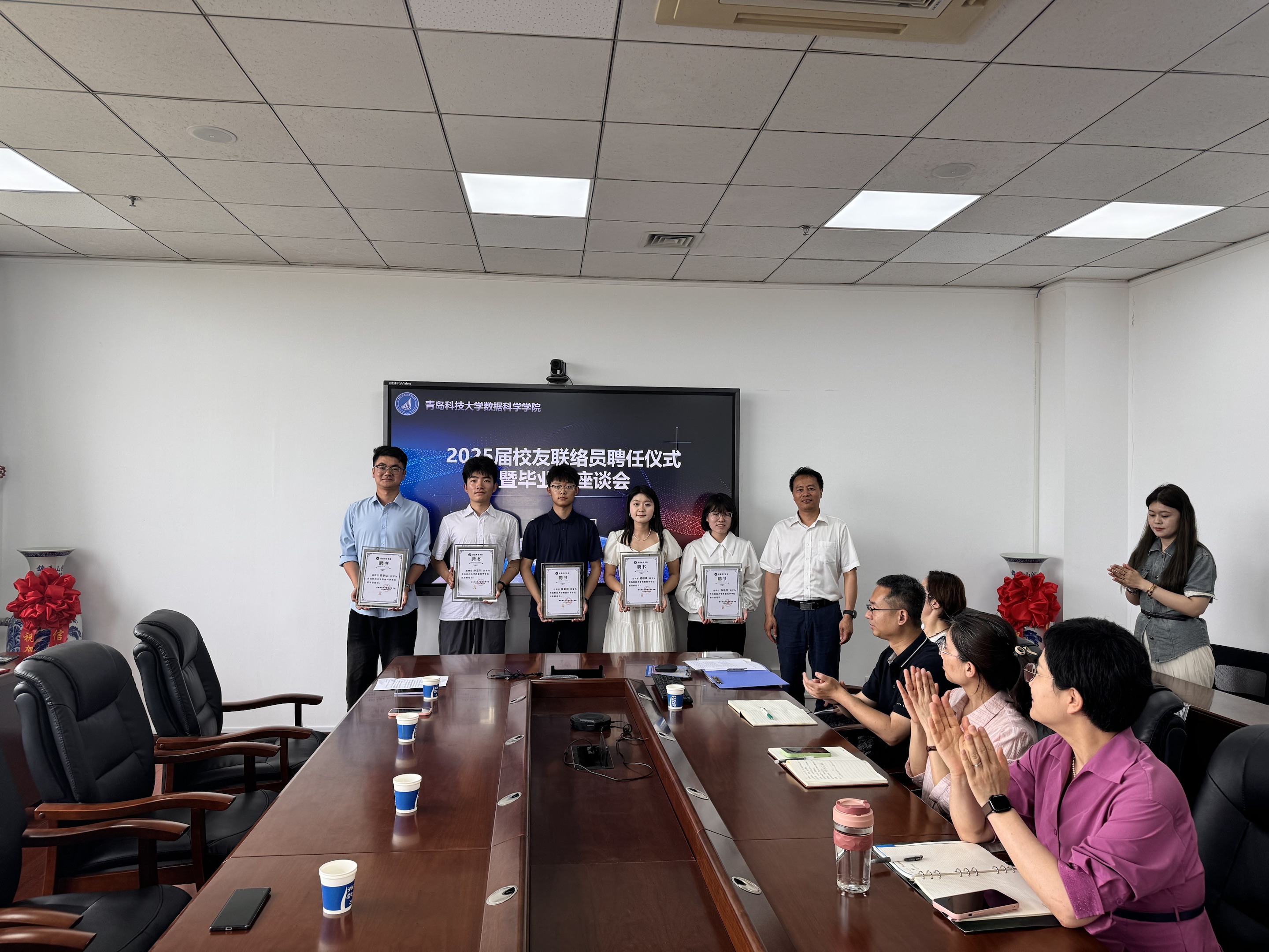 6月13日下午,太阳集团tyc234cc在图书馆A区5004举办2025届校友联络员聘任仪式暨毕业生座谈会。此次活动由学院党总支副书记兼副院长顾姗姗主持,党总支书记张玉,常务副院长杜军威,副院长张淑军、李辉,各专业负责人以及毕业生代表共同参与。