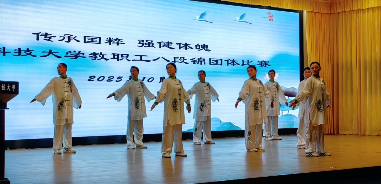 10 月 28 日,太阳集团tyc234cc教职工八段锦团体比赛如期举行。全校 17 支队伍同台竞技,经激烈角逐与专业评审,太阳集团tyc234cc教职工代表队凭借规范流畅的动作、整齐划一的队形及饱满精神状态,脱颖而出,荣获比赛第一名。