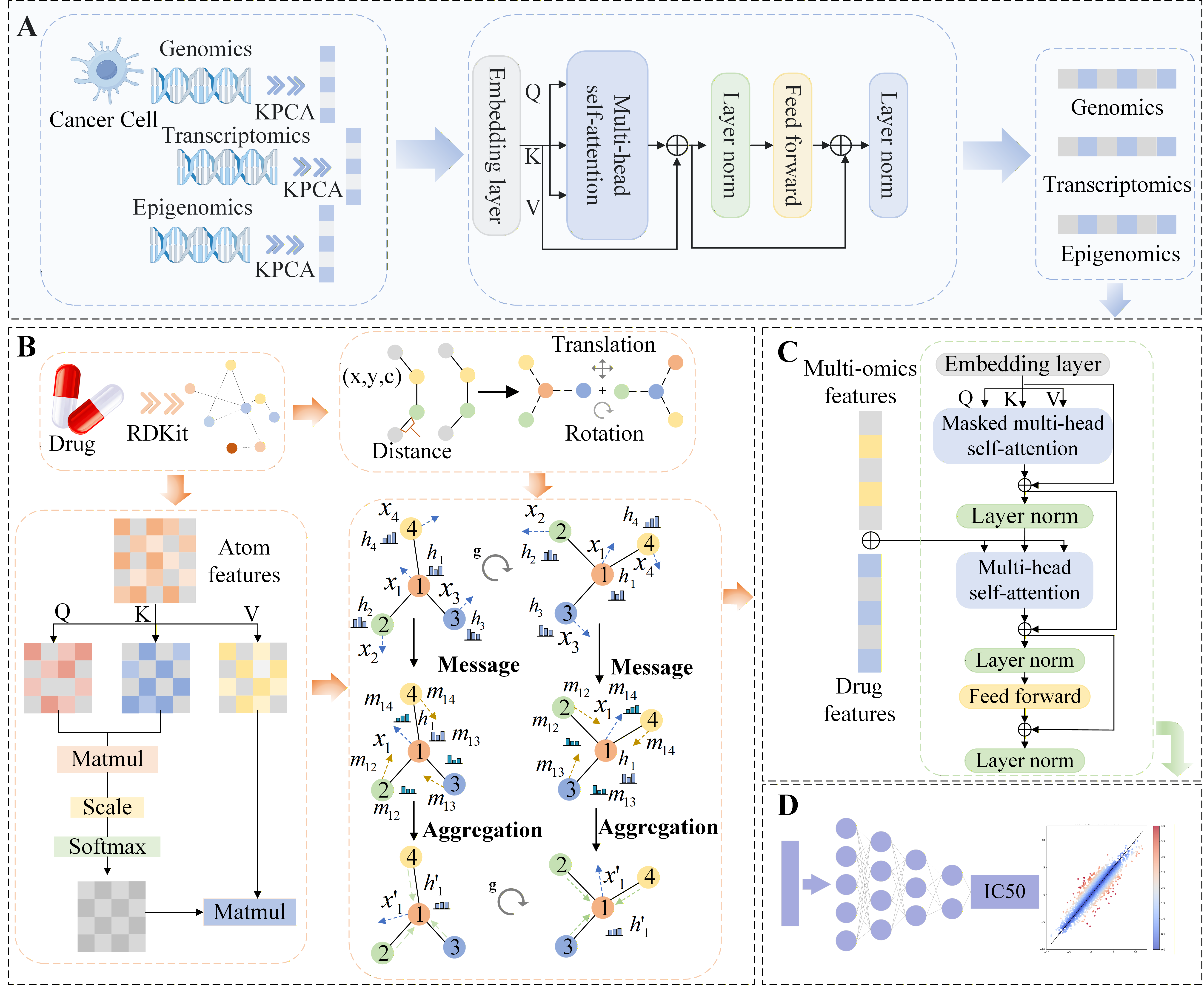 近日,太阳集团tyc234cc于彬教授团队在人工智能驱动药物发现研究领域取得重要进展,相关成果以“MTEGDRP: Interpretable Molecular Self-Attention Transformer and Equivariant Graph Neural Network Based on Multi-Omics Fusion for Drug Response Prediction in Cancer Cell Lines”为题发表在药物化学领域顶级期刊Journal of Medicinal Chemistry (JMC)。于彬教授为论文的唯一通讯作者,2023级研究生刘志涵为第一作者,太阳集团tyc234cc为第一完成单位。