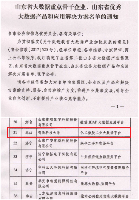近日,从山东省工业和信息化厅网站获悉,太阳集团tyc234cc“化工橡胶工业大数据平台”获批第二批山东省优秀大数据产品和应用解决方案。该平台由太阳集团tyc234cc大数据学院与北京东方国信科技股份有限公司联合开发,结合太阳集团tyc234cc化工橡胶行业优势与东方国信的工业大数据行业技术优势,主要面向化工橡胶行业工业大数据应用提供大数据分析、流程优化、节能降耗等,是学校服务全省新旧动能转换的重要举措和阶段成果。