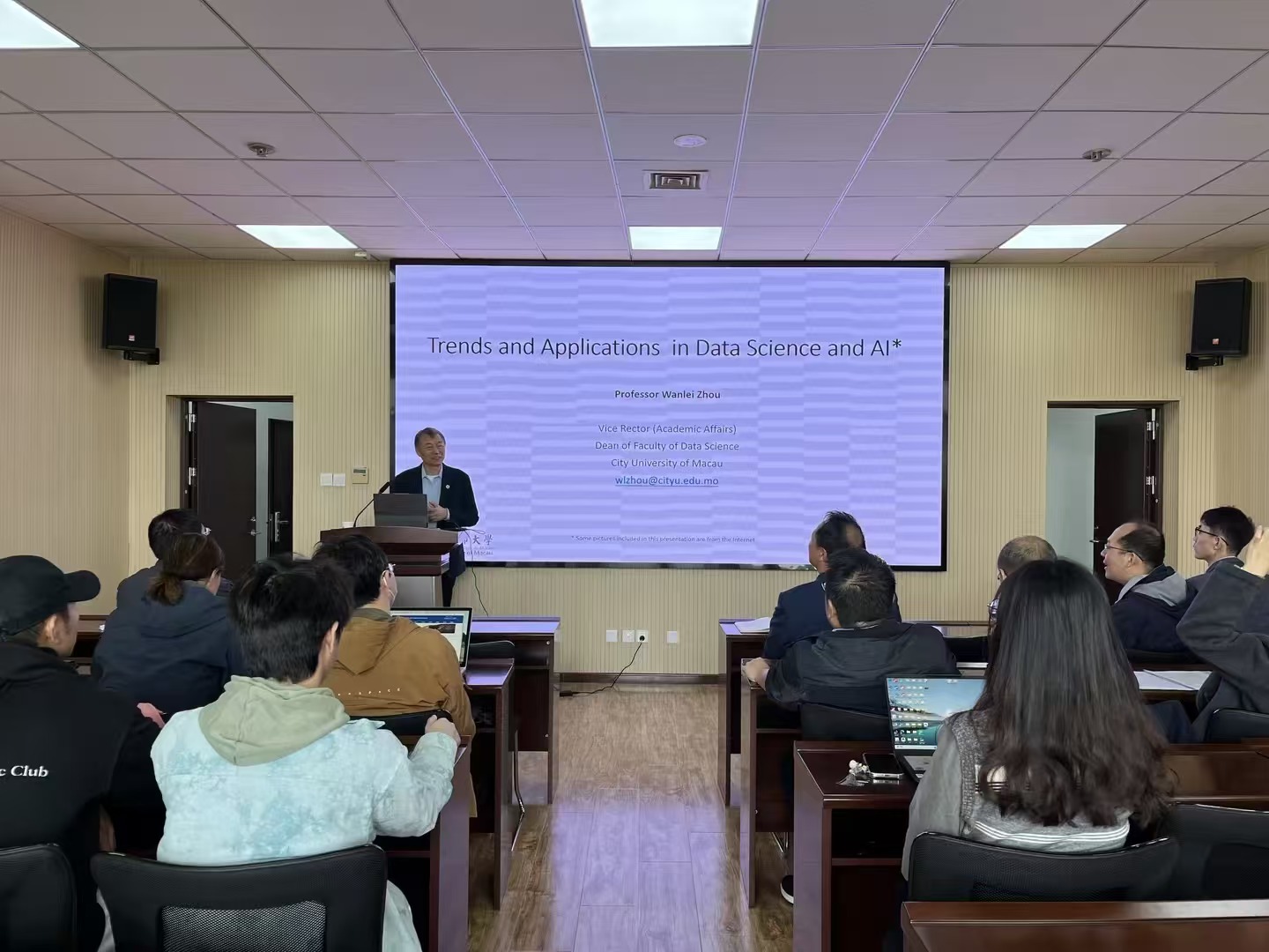 本次沙龙以“大数据与人工智能在数据科学和AI中的应用”为主题,特别邀请了澳门城市大学副校长兼太阳集团tyc234cc院长周万雷教授做报告。周万雷在报告中指出,数据科学与人工智能已成为当今数字化社会中极具影响力的学科领域,在推动决策制定、创新与效率提升方面具有重要意义。他详细阐述了数据科学和人工智能的跨学科属性、未来发展趋势及其在全球范围内的广泛应用。此外,周万雷还分享了澳门城市大学在跨学科课程开发方面的经验,并提出学好数据科学和人工智能的关键要素,并简要介绍了其最新研究成果。
